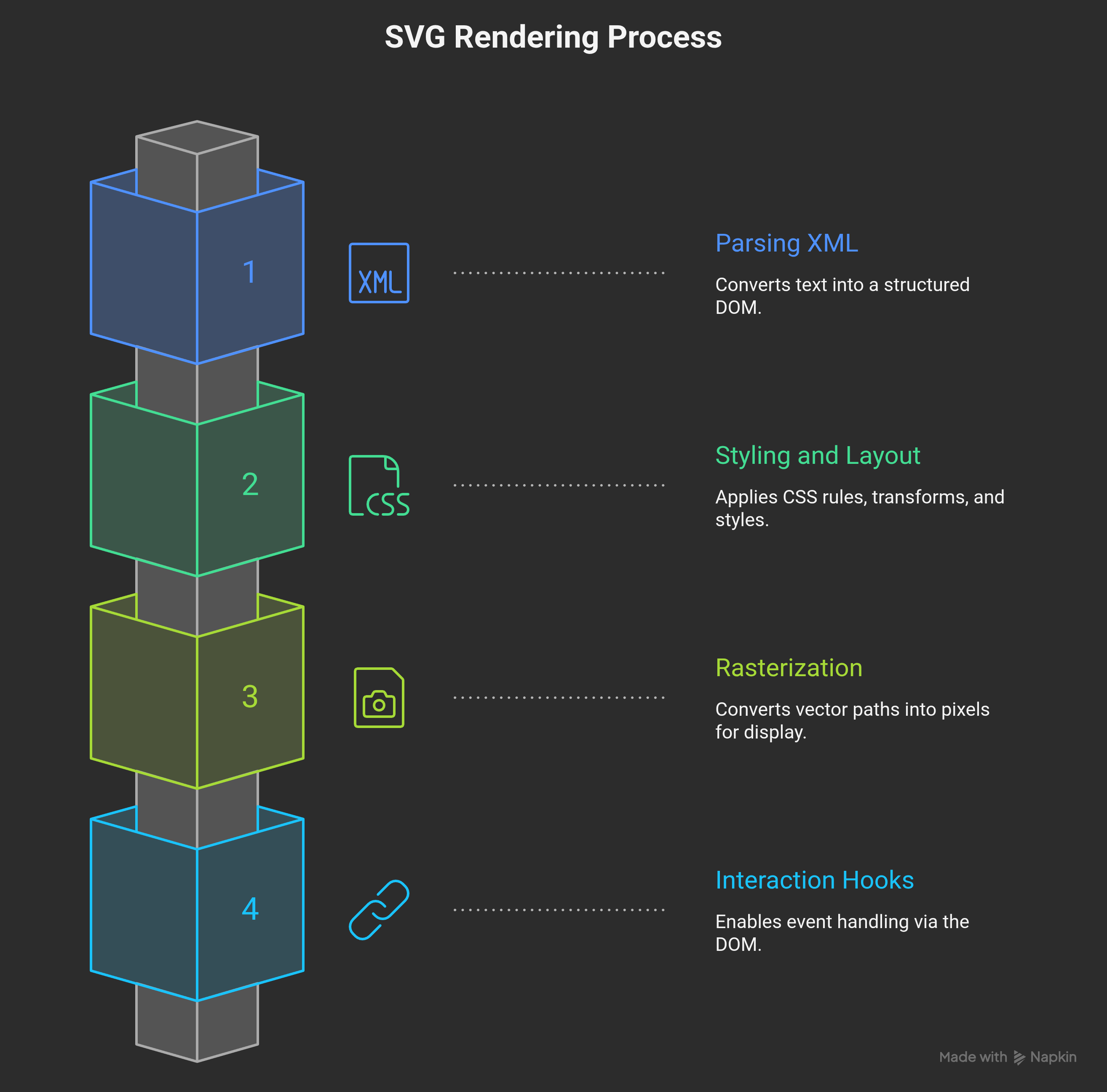 This DOM-based model is what allows developers to dynamically manipulate SVGs with JavaScript — unlike raster formats, which are static.