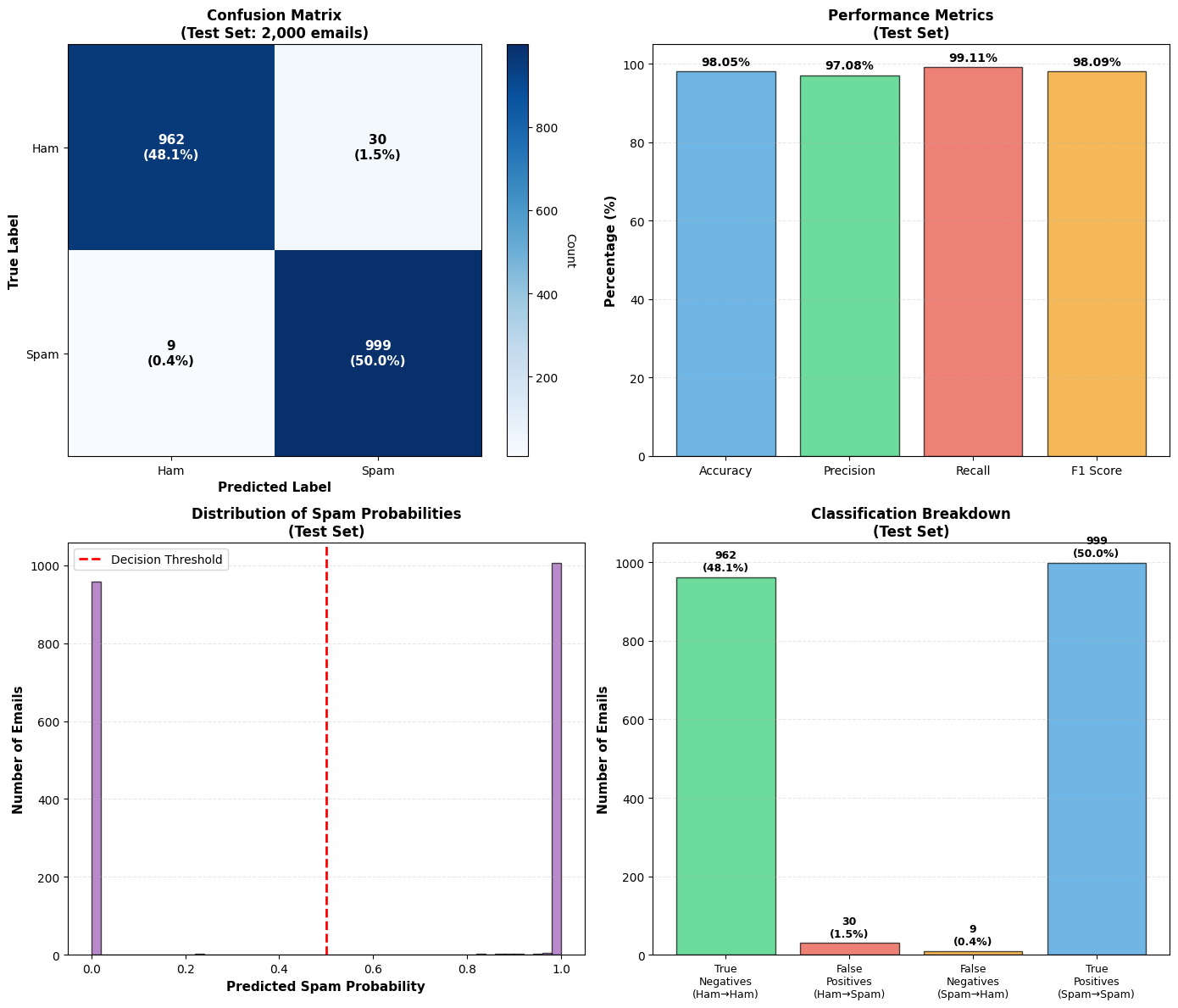 Precision: 97.08% (of predicted spam, how many were actually spam)