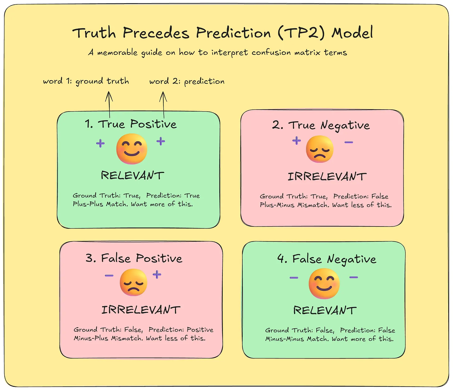 True Positive: Here ground truth is True, and the prediction is Positive. A plus-plus match. Output is relevant. We want more of this.