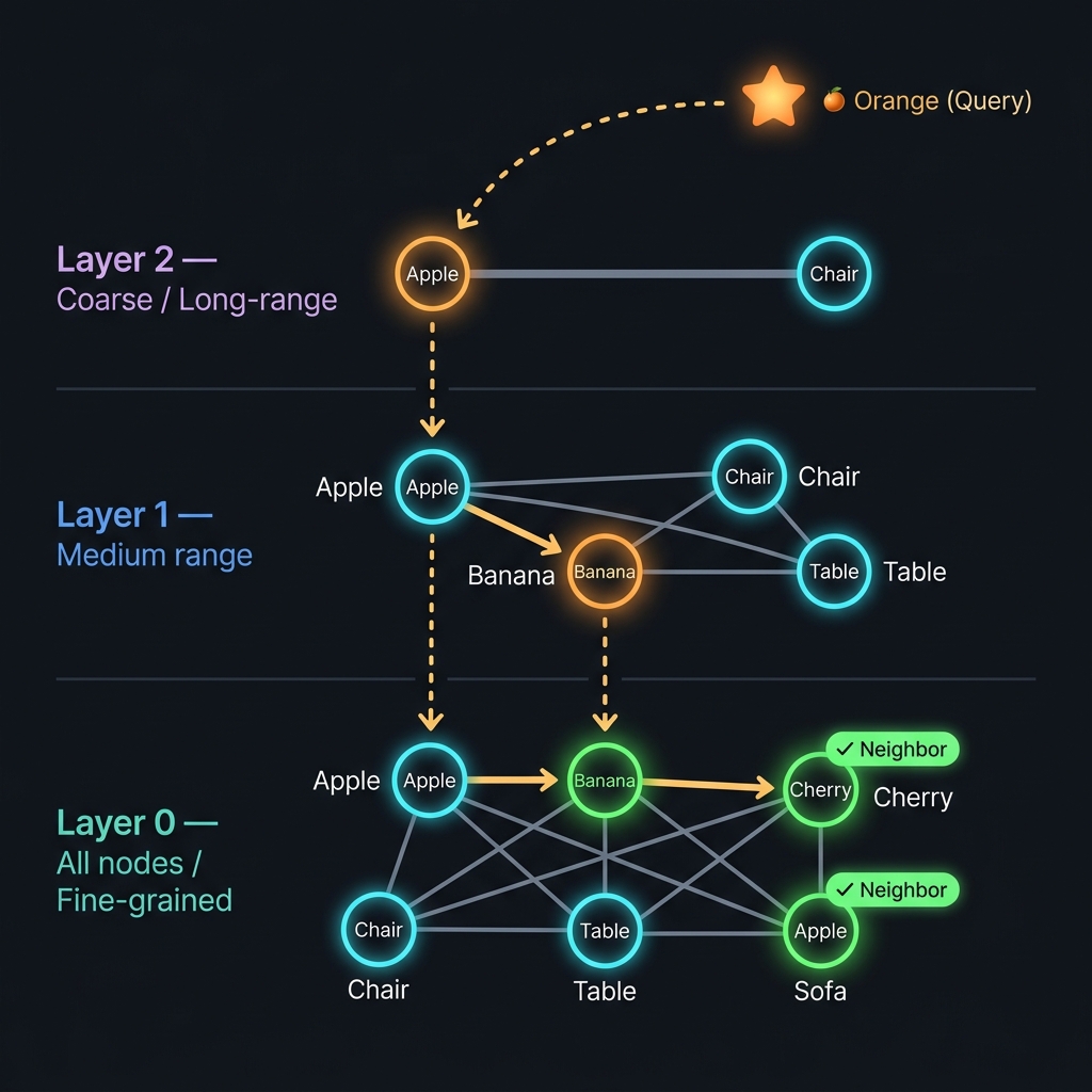 HNSW treats data the same way. It builds a map where every data point is a "node," and similar points are connected like friends. By jumping from "friend to friend" toward your target, you can navigate a massive dataset in just a few steps.