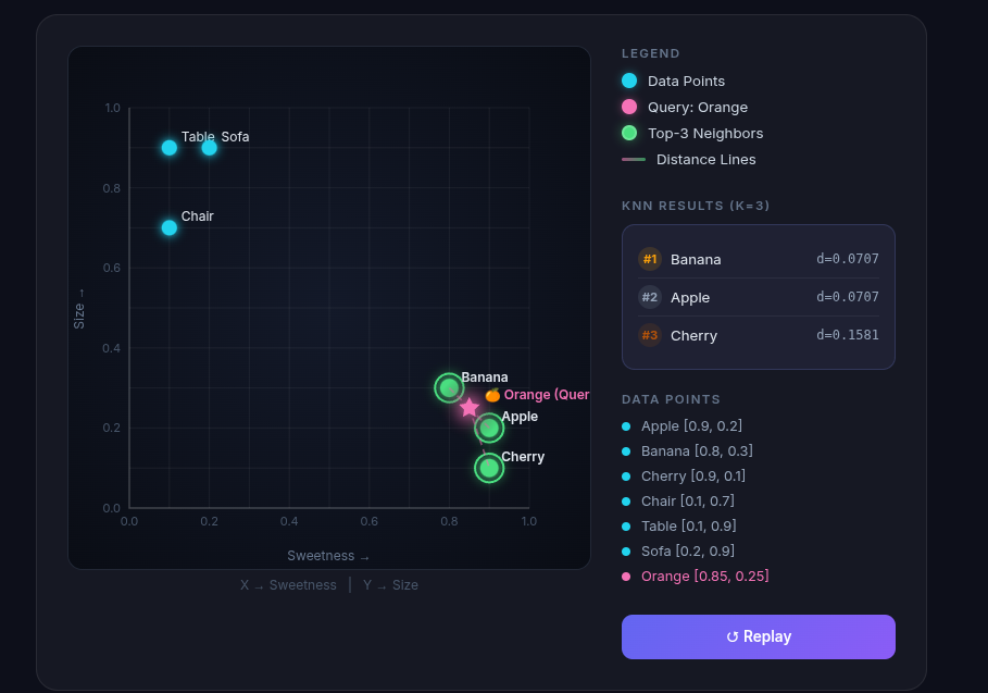 Now we search for an "Orange". We haven't told the system what an orange is, but we give it the coordinates [0.85, 0.25] (High sweetness, small size). We tell the system to find the 3 closest neighbors.