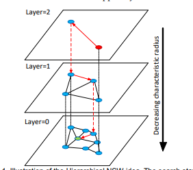 In this diagram you can see there are three layers in the graph. The top layer has only a few nodes and the bottom layer has all the nodes. The search starts from the top layer and moves down to the bottom layer.