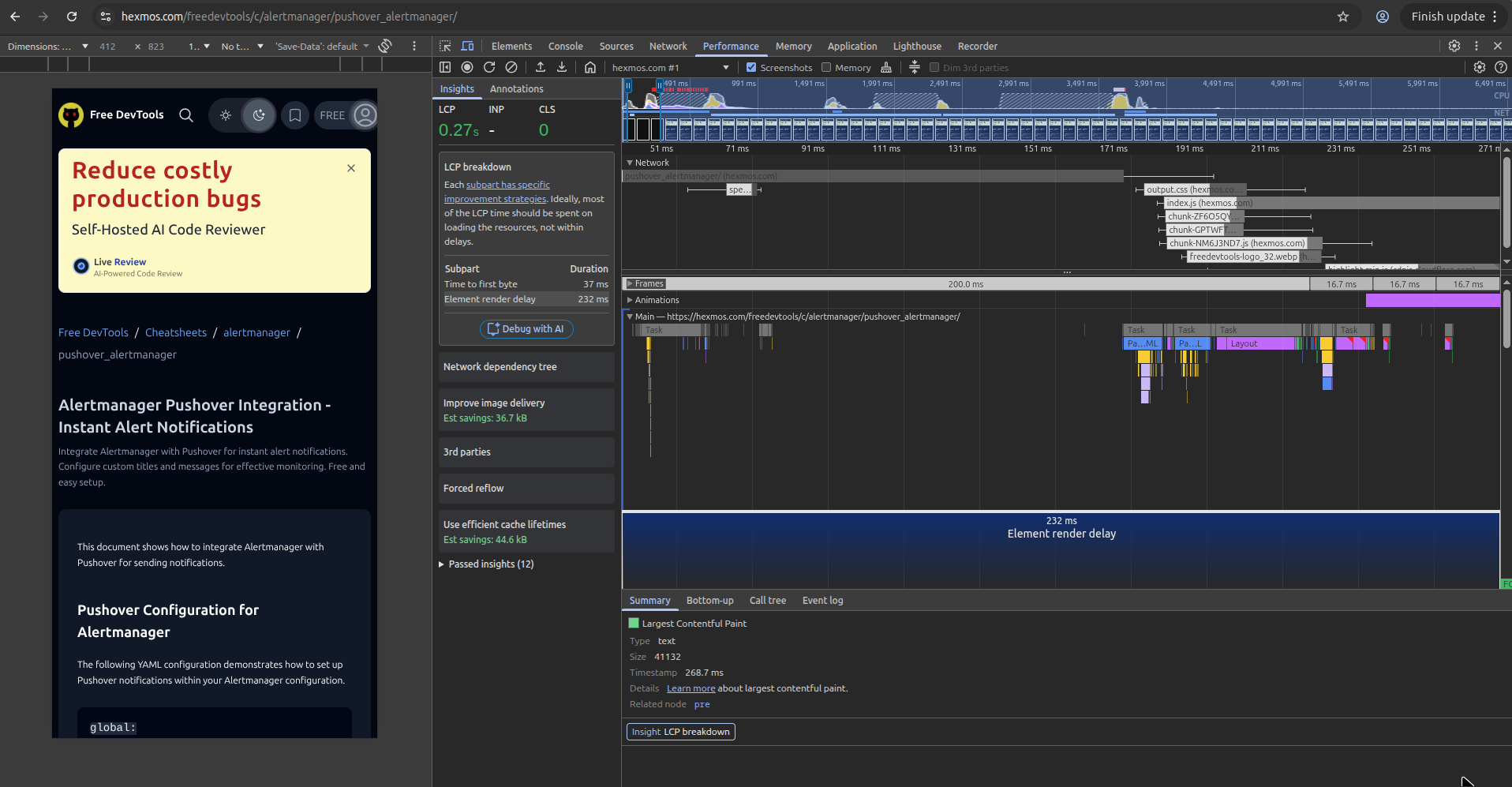 For this webpage the TTFB is 37ms and the element render delay is 232ms which contributes to total of ~0.27s LCP.