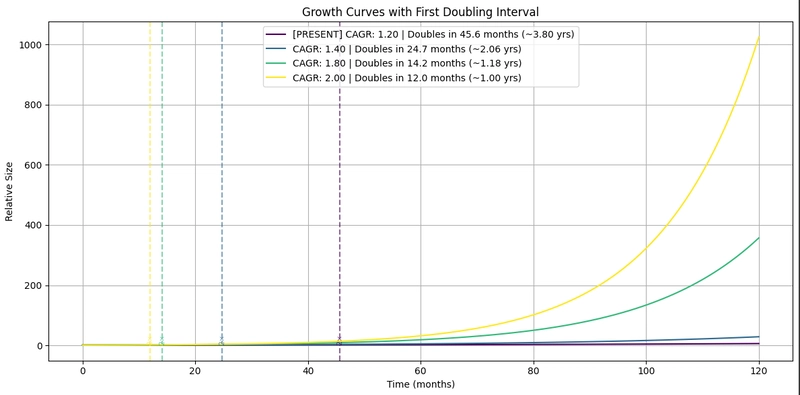 If productivity doubles and CAGR moves toward 40%, doubling time shrinks to roughly two years.