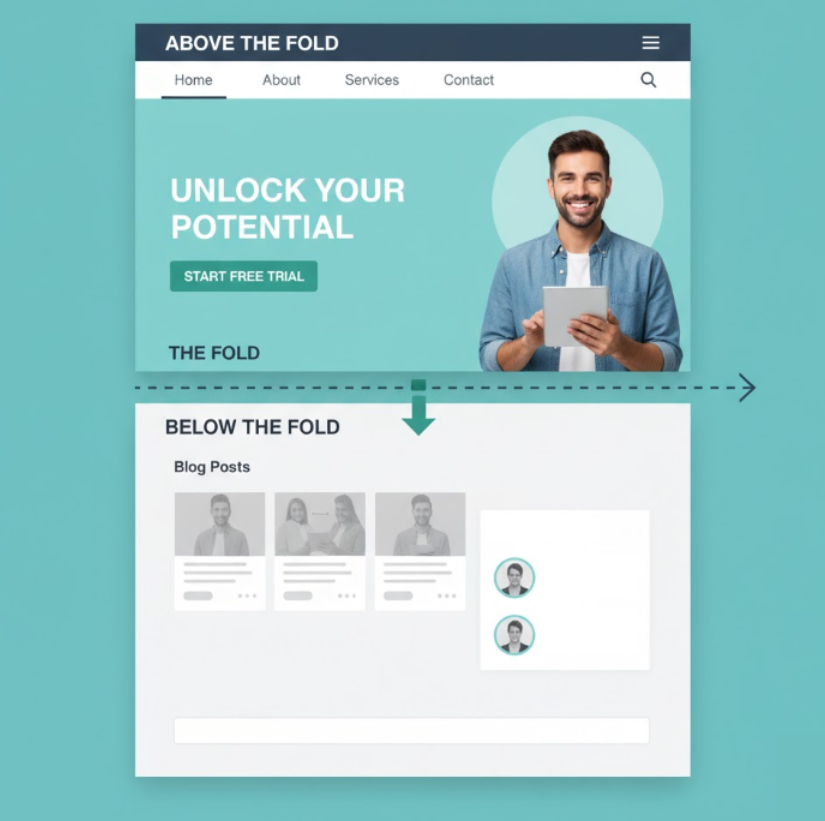 On a website, above-the-fold content is what a user sees immediately when they land on your page, before scrolling. This might include your logo, navigation bar, and hero section.