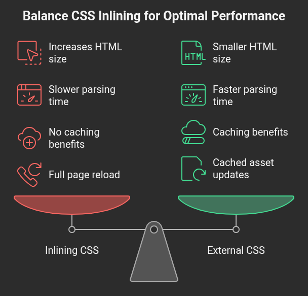 - You lose caching benefits, since inline styles cannot be stored separately.