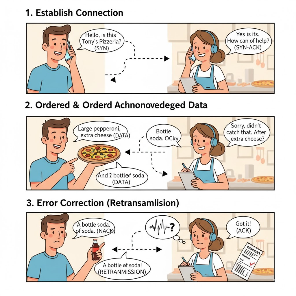 Acknowledgments (ACKs): When the receiver gets a packet, it sends back an acknowledgment, or an "ACK," telling the sender, "I got packet #5!" If the sender doesn't receive an ACK for a specific packet, it assumes it was lost and sends it again.