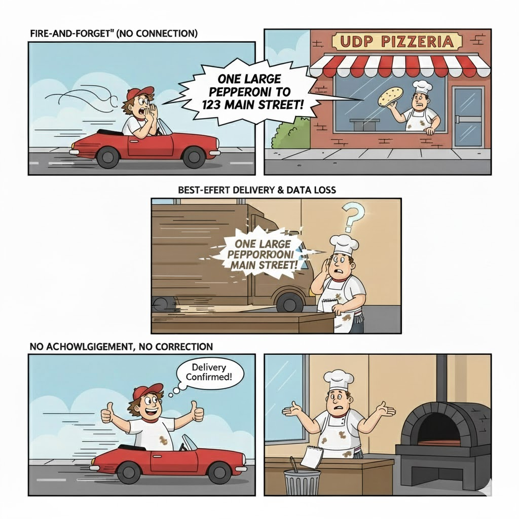 UDP (User Datagram Protocol) is the speedy, "best-effort" option. It's designed for low overhead and high speed. UDP sends packets out but offers no guarantees. It doesn't know if the data arrived, if it arrived in order, or if it was corrupted along the way. It's like dropping that postcard in the mail—it's fast and simple, but you're not entirely sure it will get there.
